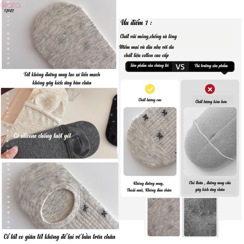 Ưu điểm : Công nghệ kim đôi ( bên trong và bên ngoài đều giống nhau) không có chỉ thừa ,không bị lỏng chân,không tuột,mỏng và thoáng khí,chất liệu cotton mềm mại , không thô cứng , giữ nguyên dáng tất sau nhiều lần giặt, không xù lông